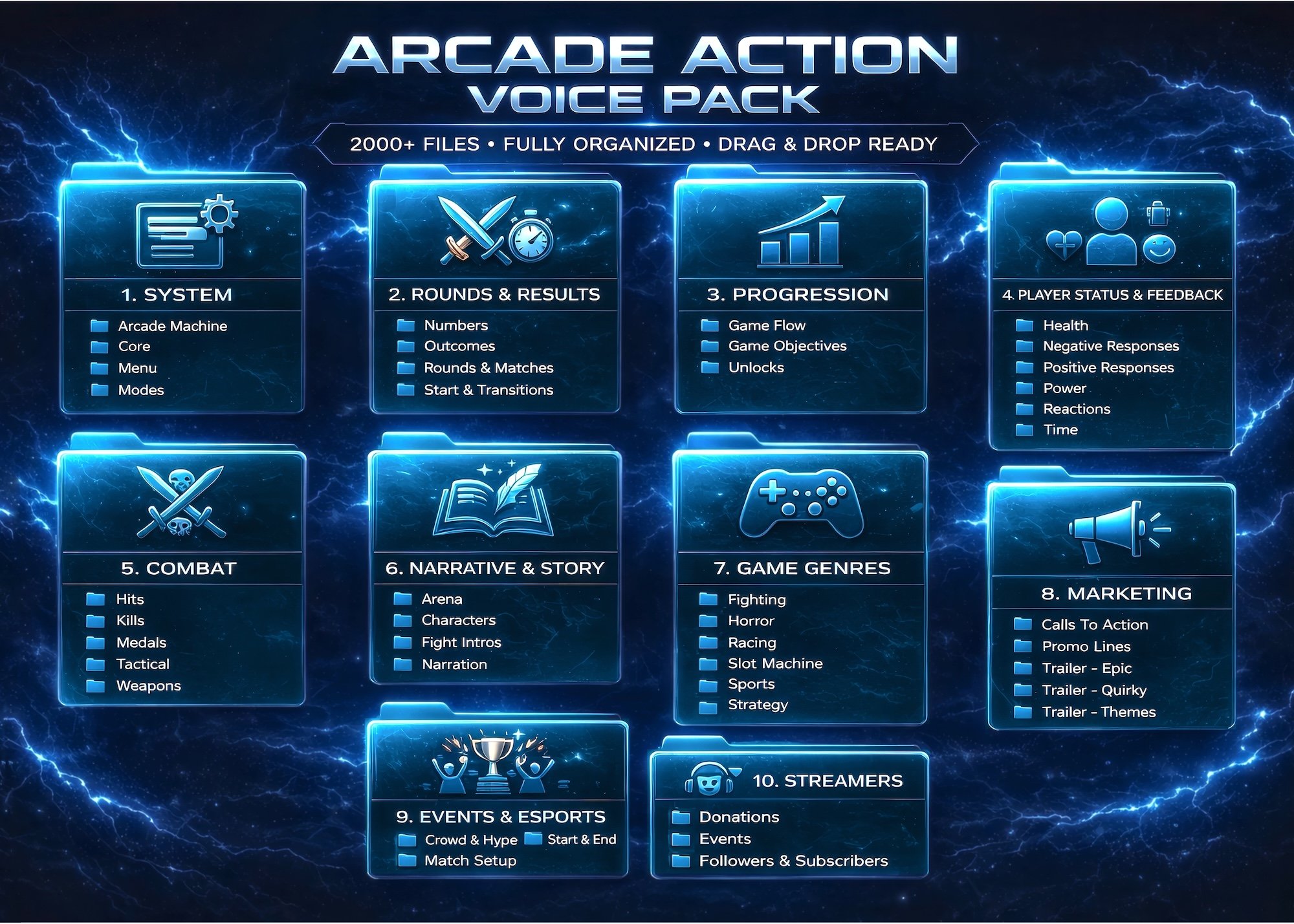 A: A wide range of competitive, gameplay-driven phrases — from match starts and power-ups to victories, player status, and trailer-style hype. Built to sound like a true arena announcer.