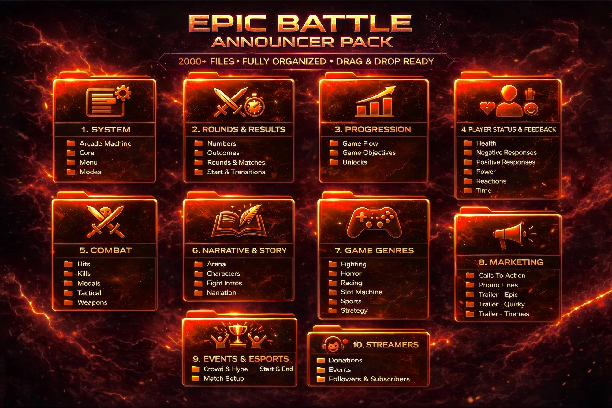 The Epic Battle Announcer voice pack is neatly organized by topic, so you can quickly find the perfect line for any project.